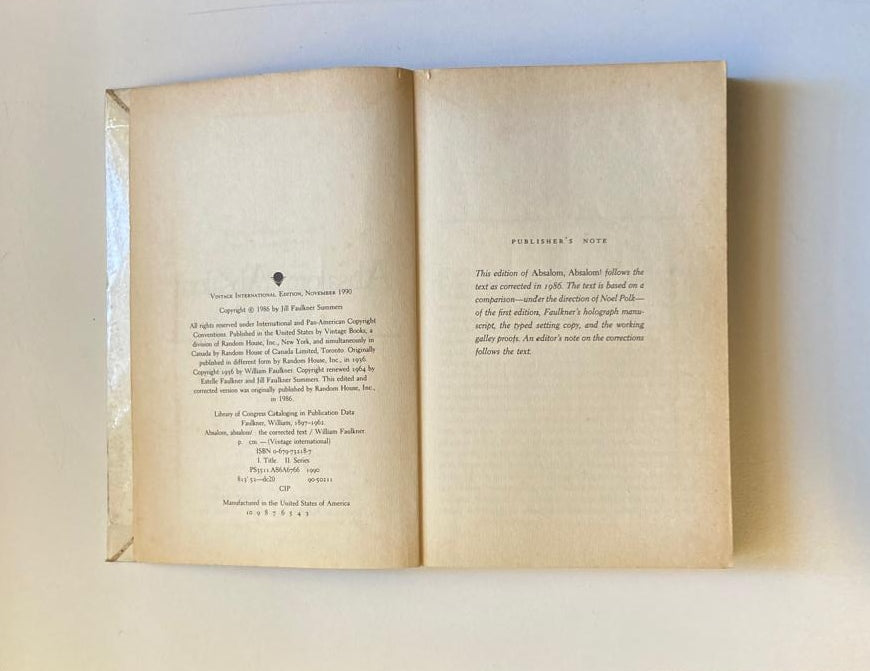This edition follows the text of Absalom, Absalom! as corrected under the direction of Noel Polk, in 1986. An editor’s note on the corrections follows the text.