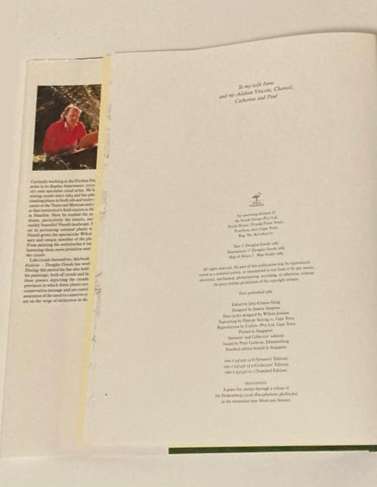 Of all the world's cycads, the genus Encephalartos is the most diverse and colourful. Each species has its own individual character with distinctive cones, stem structure and leaves, while even the disposition of the dead leaves can be a useful identification pointer. To illustrate all of these important features in one painting it proved necessary to have colourful photographs of the habitat and close-up photographs of the plants themselves. With these aids, and from his wealth of field experience, Douglas Goode has successfully captured the form , textures and colours of each cycad in a way that will delight all cycad enthusiasts, particularly in the case of those groups of closely related species whose members can appear identical at first sight.