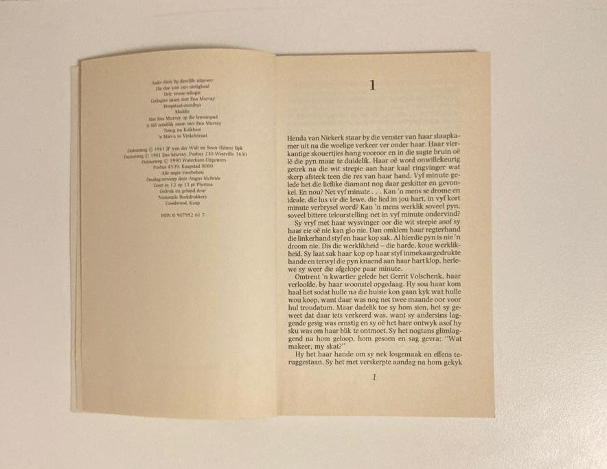 Die trourokmateriaal was reeds gekoop. Trougeskenke het al begin aankom, haar bedanking as onderwyseres reeds ingedien… En nou is daar net die wit strepie om haar vinger waar die verlowing was om haar te herinner aan die droom wat so skielik aan skerwe gespat het.