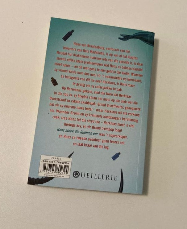 Hans van Kraaienburg, verlosser van die inwoners van Huis Madeliefie, is op van al hul klagtes. Nadat hul drakoniese matrone iets van die verlede is, is daar steeds sulke klein probleempies wat Hans as beheerraadslid moet oplos – en dít met gans te min geld in die kittie. Wanneer sy vriend Vasie hom dus nooi vir ’n vakansietjie op Hermanus, as huisgaste van dié se neef Herklaas, is Hans maar te gretig om sy safaripakke te pak.