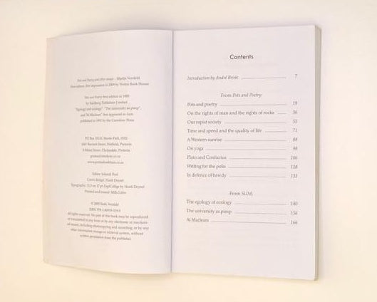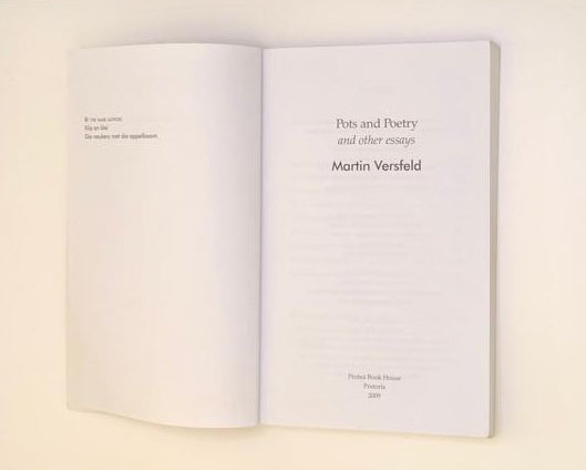 In Pots and Poetry and other essays we find a distillation of his thoughts on man's place in the world and the world's place in man, synthesising Eastern and Western world views. In essays ranging from investigations into the quality of life and the similarities between Plato and Confucius to a defence of the bawdy, Versfeld found nothing too insignificant for his interest - in this original mind rocks and pots held an interest equal to that of the great questions of life.