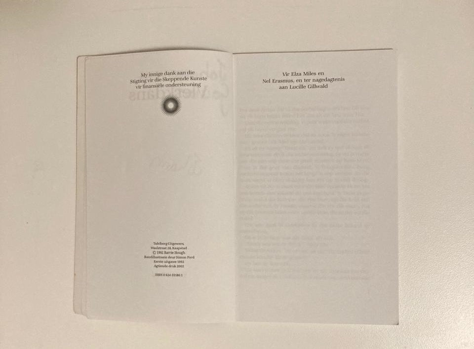 My pa se blou oë staar terug na my uit die spieël onder wenkbroue wat, nes syne, bokant die neus saamloop. Carol, een van my klasmaats, het eenmaal vir my gesê jy kan nooit ‘n man vertrou wie se wenkbroue een word nie. “Hulle is wolwe.” Ek wonder of Ma sal saamstem. Carol het dit seker ook vir die ander meisies vertel. Hulle noem my soms Wolfie.